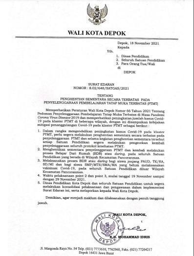 SE yang diterbitkan 18 November 2021 ini telah memperhatikan Peraturan Wali Kota (Perwal) Depok Nomor 66 Tahun 2021 tentang Pedoman PTMT di masa pandemi Corona Virus Disease 2019 (Covid-19). Dan juga mencegah adanya peningkatan jumlah kasus Covid-19 pada klaster PTMT di beberapa wilayah.